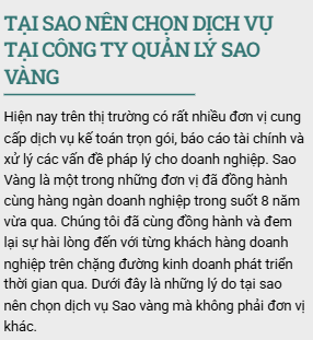 Thực tế, không phải là vài vấn đề, mà có rất nhiều vấn đề cần quan tâm xoay quanh việc thành lập, quản trị doanh nghiệp. Sao Vàng hiểu rõ những khó khăn, vướng mắc ban đầu mà khách hàng gặp phải, chính vì vậy Công ty chúng tôi được thành lập với mong muốn tạo ra môi trường làm việc có thể hỗ trợ hết mình cho doanh nghiệp để giúp doanh nghiệp tiết kiệm thời gian, chi phí, nhân sự trong quá trình vận hành, phát triển công việc kinh doanh.